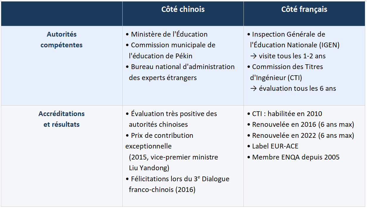 Sous la direction des services compétents de l'Université Beihang et du Groupe des Écoles Centrale, Centrale Pékin met en œuvre une supervision complète sur la formation afin d'assurer sa qualité. L'École est soumise à des évaluations et certifications régulières :