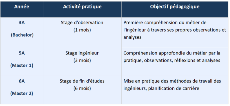 L'enseignement pratique accompagne toutes les étapes de la formation. En plus des expériences en classe et de la formation technique, les élèves sont amenés à réaliser un projet de fin d'études de Bachelor, un projet en relation forte avec l'entreprise (PIC), un mémoire de recherche de Master, ainsi que trois stages.
